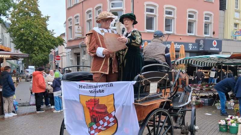 Am Sonntag fuhren Graf Konrad von der Mark und seine Gemahlin Elisabeth von Cleve in einer Kutsche auf den Platz an der Schlanken Mathilde. Markus Stock vom Hörder Heimatverein begrüßte das Regentenpaar stellvertretend für alle Hörder Bürger und erinnerte daran, dass Konrad und Elisabeth auf der Hörder Burg gelebt und viele Feste gefeiert haben.